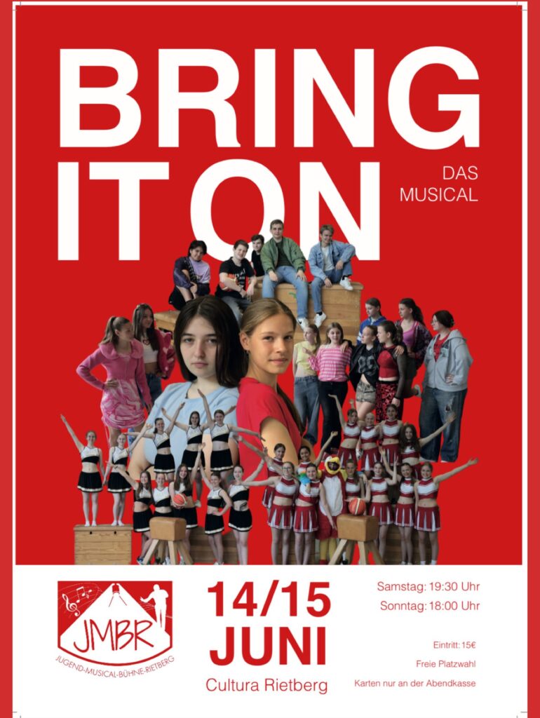 Am 14. und 15. Juni 2025 spielen präsentieren wir Ihnen das Musical „Bring it On“ in der Cultura in Rietberg. Am Samstag, dem 14. Juni um 19:30 und am Sonntag, dem 15. Juni um 18:00. Karten können Sie an der Abendkasse erwerben. Es gibt freie Platzwahl – wer zuerst kommt, mahlt zuerst!